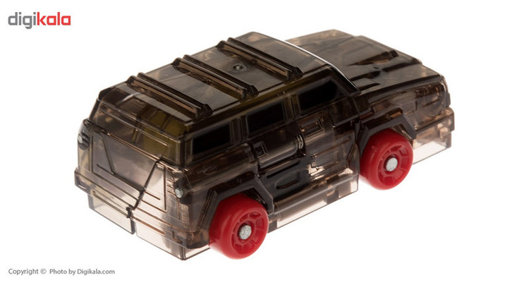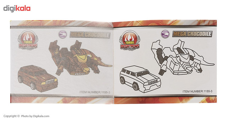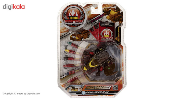 این ماشین 7.5 سانتیمتری جنسی پلاستیکی دارد و بهصورت فانتزی طراحیشده است. در این ماشین یک قطعهی آهن رباست که در حین تماس با کارتهای 6.5 × 4.5 سانتیمتری تبدیل به یک فیگور Mega Crocodile به ارتفاع 11.5 سانتیمتر میشود. بر روی کارتهای این اسباببازی، لایهی فلزی وجود دارد که به قفل آهنربای ماشین قهوهایرنگ چسبیده و ناگهان تبدیل به فیگور با همان رنگ میشود. طراحان این اسباببازی تبدیل شونده، به خلاقیت بچهها هم اهمیت میدهند و یک دفترچهی 12 صفحهای با هفت الگو جهت رنگآمیزی دربستهی آن وجود دارد. کودکان میتوانند با شش مداد شمعی باکیفیت، آنها را رنگآمیزی کنند. این اسباببازی جالب یک صفحهی بازی از جنس گلاسه و به ابعاد 41.5 × 28.5 سانتیمتر وجود دارد که راهنمای بازی به زبان انگلیسی است که کارت و ماشین را برای بازی بر روی آن قرار میدهند.