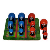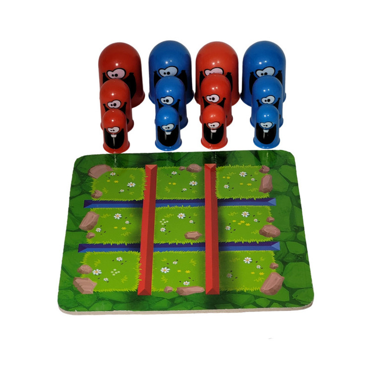 استراتژی بازی: بازی دونفره که هر نفر دارای 6 مهره می باشد و به ترتیب دارای 2مهره بزرگ 2مهره متوسط 2مهره کوچک است و در دورنگ آبی و قرمز به مبارزه می پردازند.مهره ها به ترتیب از بزرگ به کوچک داخل هم قرار میگیرند یا به عبارتی مهره های بزرگتر مهره های کوچکتر را می خورند. صفحه بازی مربعی شکل، دارای 9مربع مساوی میباشد. شیوه بازی به این گونه است که هر شخص در هر نوبت میتواند یک حرکت انجام دهد و باید سه مهره همرنگ خود را در یک راستا در سه مربع داخل صفحه قرار دهد طرف مقابل نیز میتواند مانع ردیف شدن مهره ها شود و توسط مهره های بزرگتر مهره های کوچکتر رقیب را بخورد، حتی شما میتوانید برا یخفظ مهره های خود، مهره خود را نیز بخورید. در صورت پایان مهره های خارج از صفحه مهره های داخل صفحه جابجا خواهند شد. در آخر اگر حریف تمرکز لازم را نداشته باشد مهره ای که قبلا برای جلوگیری از در یک راستا بودن مهره طرف مقابل گذاشته را بردارد و مهره زیرین باعث ردیف شدن سه مهره بازیکن مقابل شود حریف او برنده است.