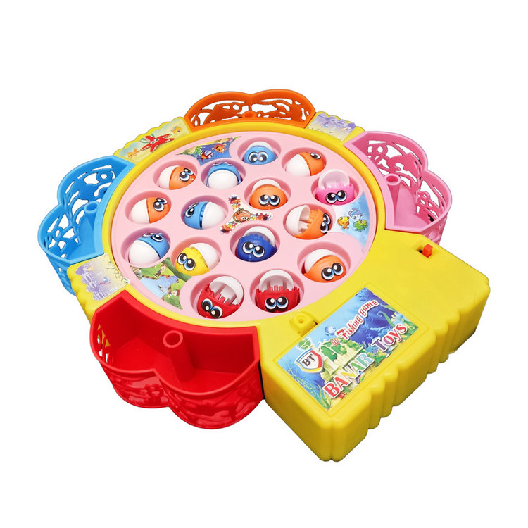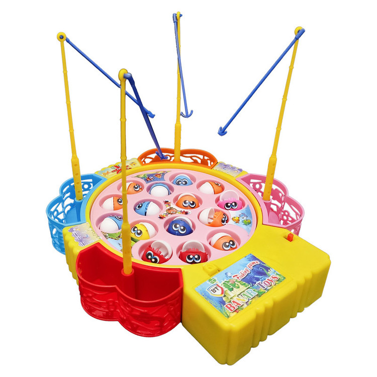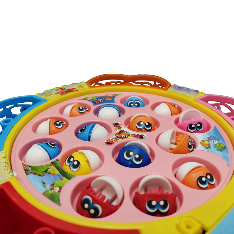 اسباب بازی ماهیگیری موزیکال یک اسباب بازی سرگرم کننده و شادی بخش برای کودکان می باشد. این اسباب بازی دارای 4 قلاب ماهی گیری و 15 ماهی رنگی است. برای استفاده از این محصول ابتدا باید اسباب بازی ماهیگیری را روشن کنید تا مسابقه شروع شود، سپس مشاهده خواهید کرد که یک صفحه مدور همانند یک دریاچه کوچک در حال چرخیدن است و ماهی های رون آن دهانشان را باز و بسته می کنند، کودک شما باید یکی از قلاب ها را انتخاب کرده و همانند یک ماهیگیر، قلاب را بچرخاند تا یکی از ماهی ها به سر قلاب گیر کند تا آن را بیرون بکشد. چه کسی برنده است ؟؟؟ هر بازیکنی که در انتها ماهی بیشتری شکار کند برنده است. بازی ماهیگیری به صورت انفرادی، 2 نفره، 3 نفره و 4 نفره نفره نیز قابل انجام است. جنس این اسباب بازی از پلاستیک مرغوب بوده و از رنگ های شاد برخوردار است به همین دلیل کودک شما را به خود جذب می کند. در حین بازی موزیک زیبایی پخش می شود که لحظات بازی کودک را لذتبخش تر می کند.